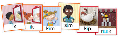 In het lokaal van groep 3 hangen wandplaten van ‘ik’ (een spiegel), ‘kim’ en vervolgens ook sim en een letterbord, waarop achtereenvolgens de i, k, m, s worden gehangen.