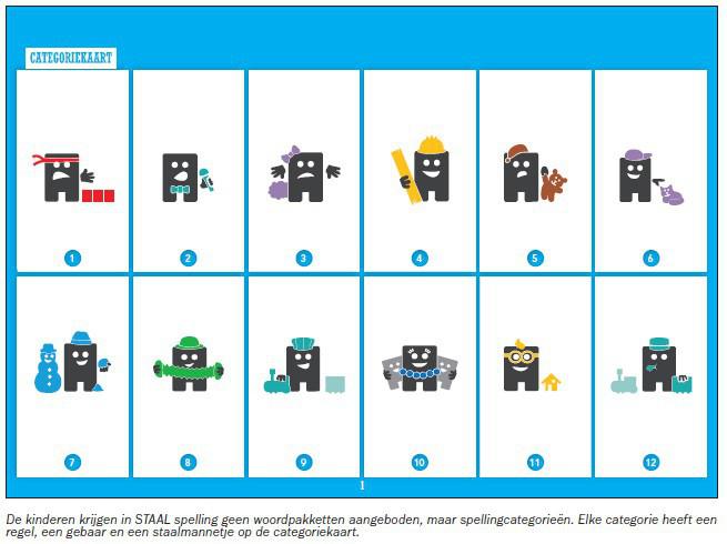 We werken met STAAL spelling in groep 4. In groep 4 worden de 12 categorieën geïntroduceerd (spellingsregels). Elke categorie heeft zijn eigen spellingsregel, waardoor het makkelijker wordt om woorden goed te kunnen schrijven.
